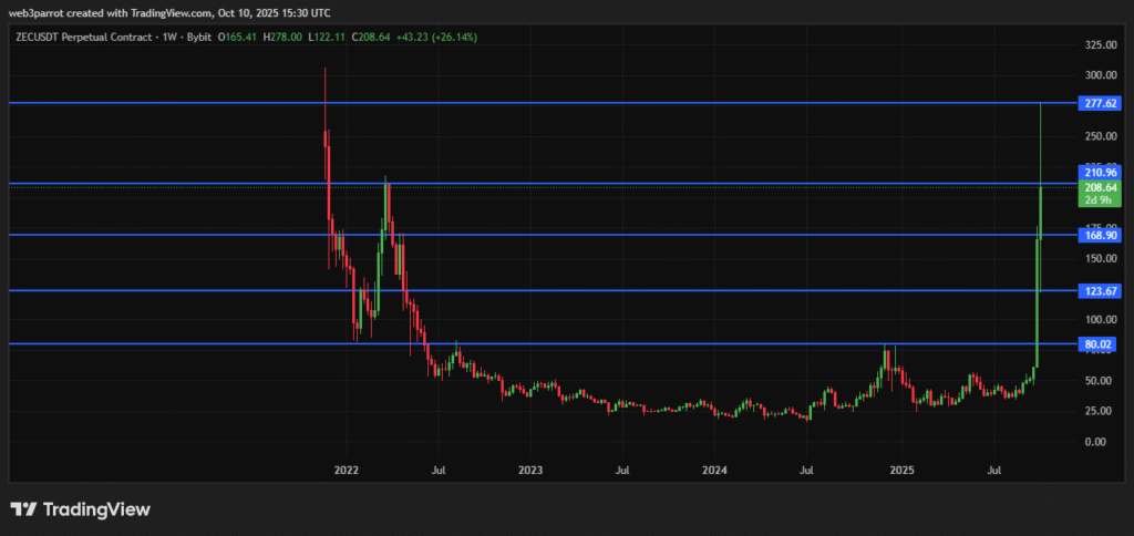 On the chart, ZEC faces key resistance zones at $210.96 and $277.62, while immediate supports lie at $168.90, $123.67, and $80.02. These levels will define how strong this new uptrend truly is.